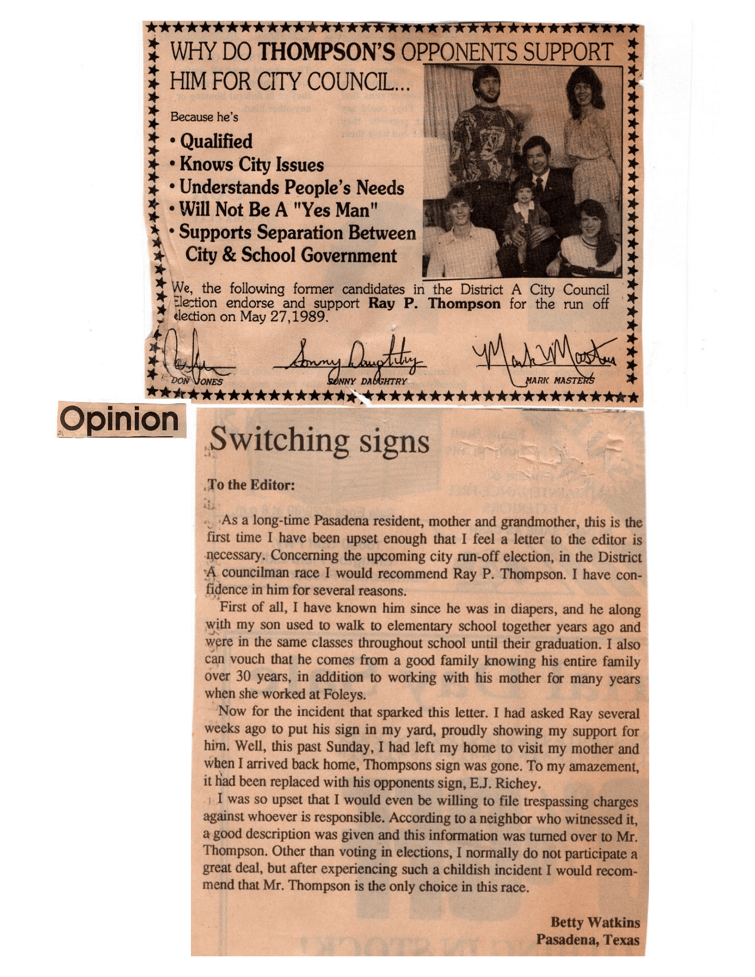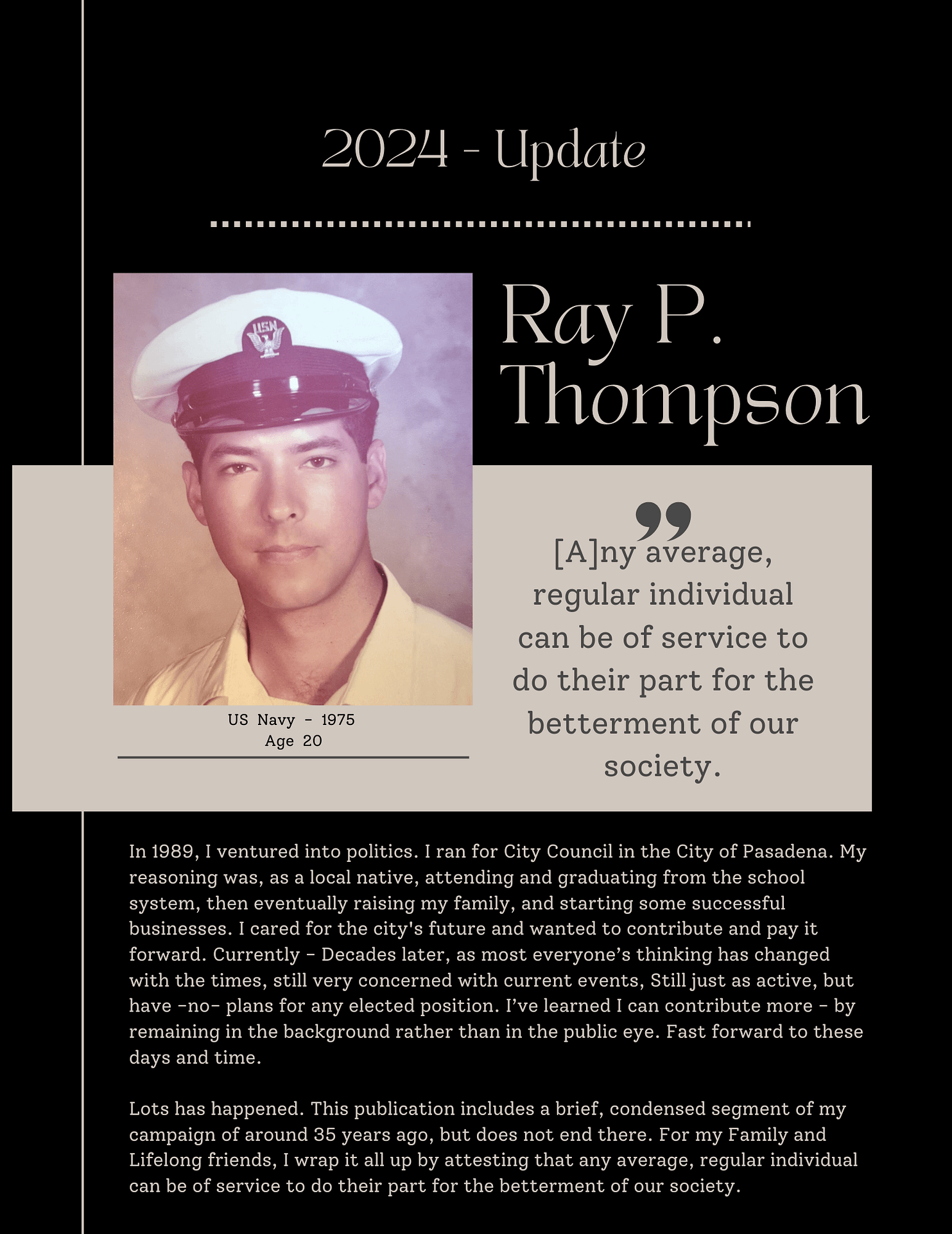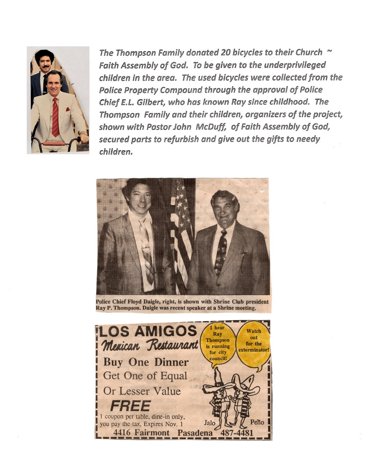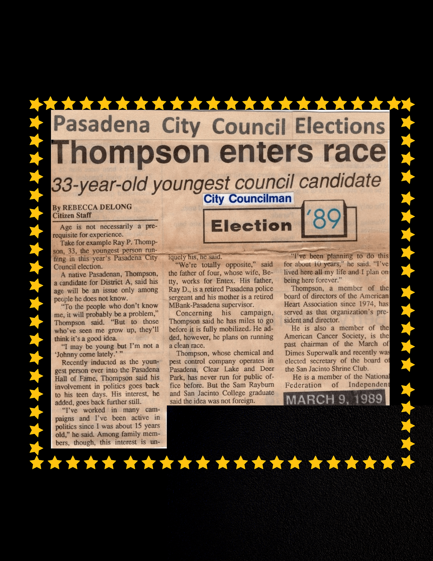 Ray P. Thompson is a dedicated community leader and active member of Rotary Club International, where he focuses on fostering global collaboration and impactful initiatives. A champion of Republican Christian values, Ray plays a key role in the San Jacinto Conservatives, advocating for Veterans, Patriots, and his faith-driven principles. Ray’s leadership extends to his time as Past President of the San Jacinto Shriners in 1991 and as a 32nd Degree Mason with the Arabia Temple Shrine. His expertise was recognized when he was appointed by the Governor of Texas to the Texas State Chemical Board in 1993, showcasing his commitment to public service at a state level. While his honorable military service in the U.S. Navy South Pacific Fleet remains a proud part of his legacy, Ray’s focus today is on building stronger communities through service, advocacy, and collaboration.